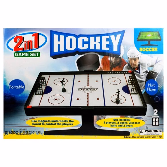 The 2-in-1 game set is great to get your game on with friends and family by challenging them to a hockey or soccer game. Use the magnets underneath the board to control the players. Set includes two players, two pucks, two soccer balls, and two goals. It is approximately 20″ long x 12″ wide x 5.5″ tall, and intended for people over 13 years of age. Comes packaged in a box.