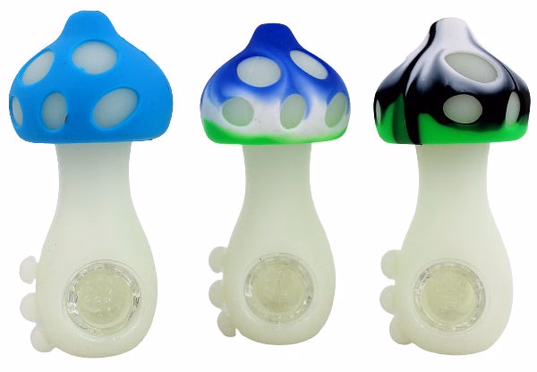 Mushroom Glow in the Dark Silicone Hand Pipe with Glass Bowl. Colors May Vary. 4.5″. 5ct.