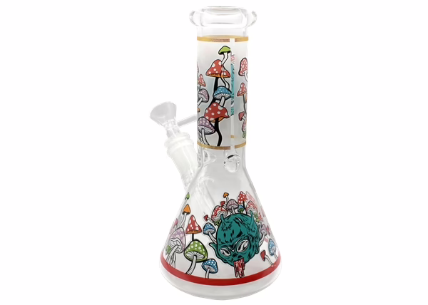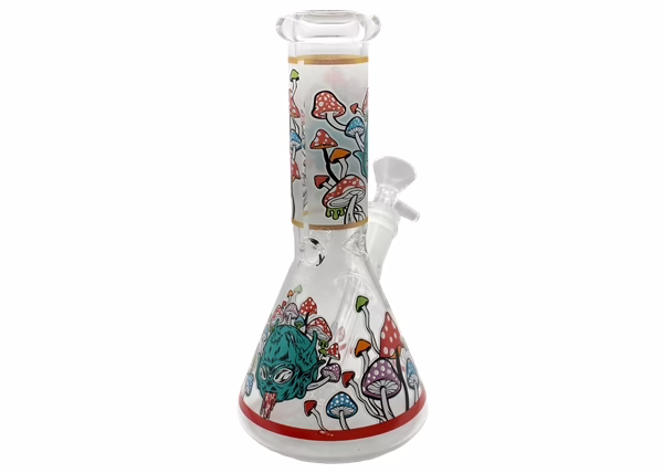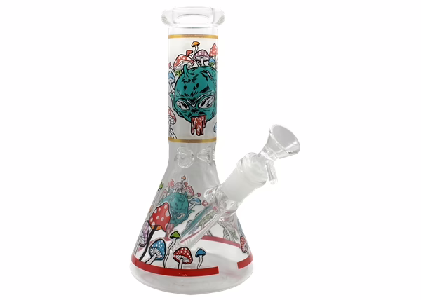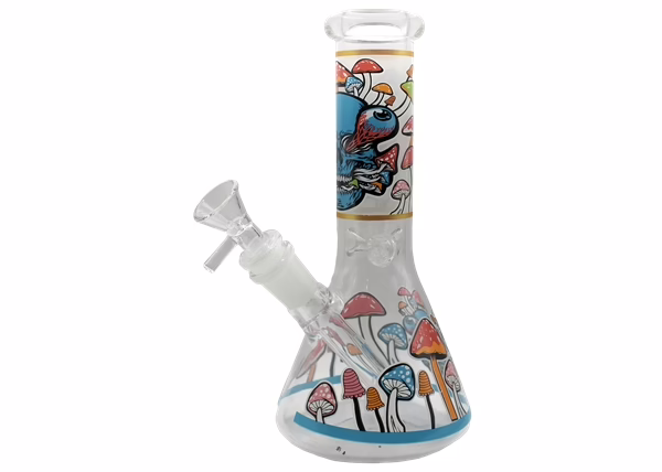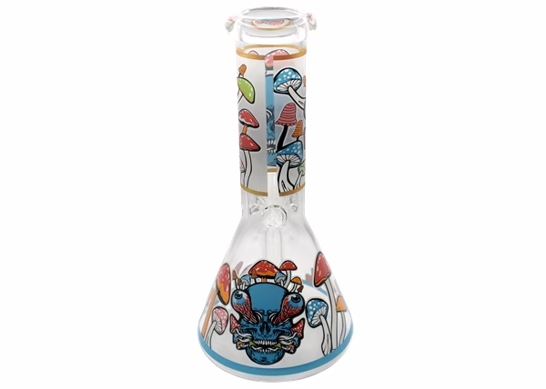 Glass on Glass Beaker Water Pipe – Mushroom Skulls. Bowl and Stem Included. Design May Vary. 8″. 1ct.