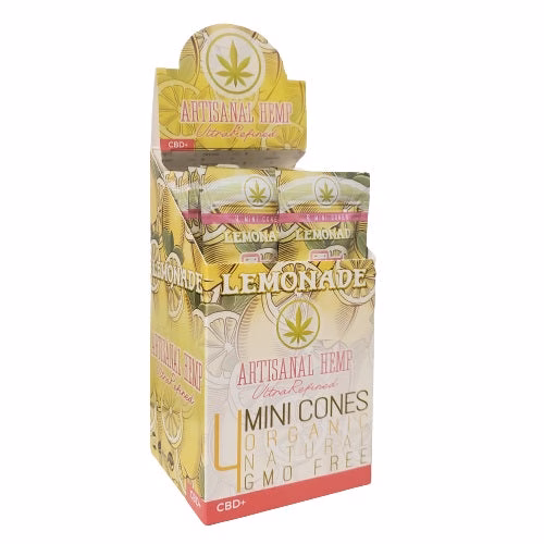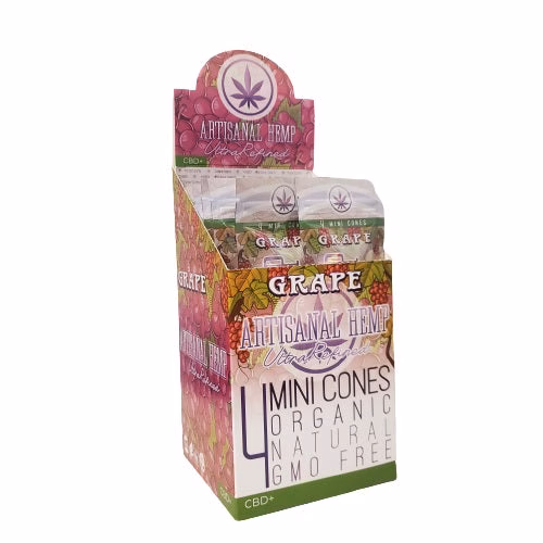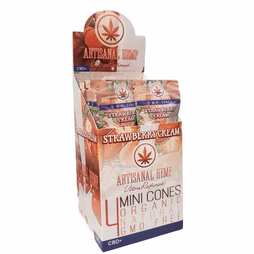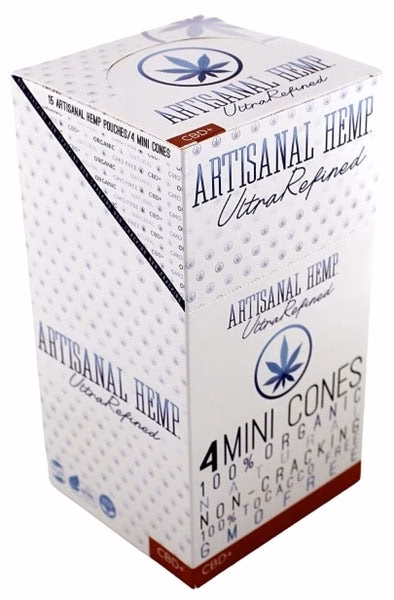 Artisanal Hemp Ultra Refined Mini Cones. 15 Packs in a box display with 4 cones per pack.