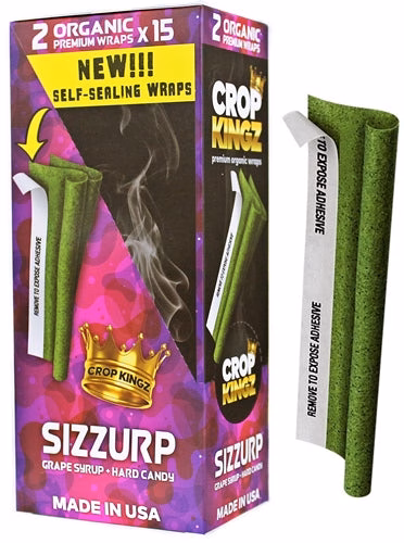 Crop Kingz Premium Hemp Wraps – Sizzurp. Grape Syrup + Hard Candy. 2 Wraps Per Pack With 15 Packs In A Box.