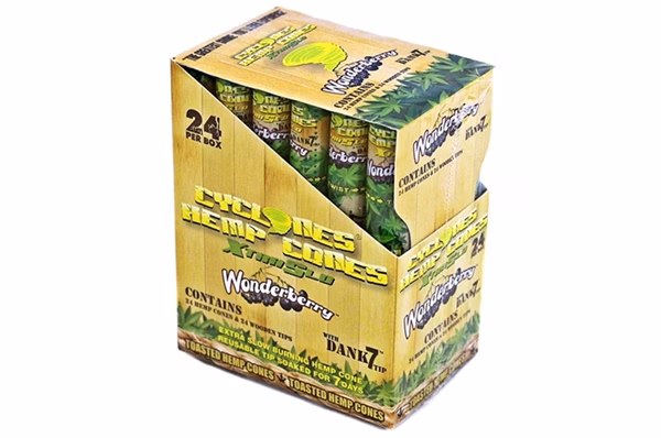 Cyclones XtraSlo Hemp Cones – Wonderberry With Dank 7 Tip. Contains 24 x Hemp Cones & 24 x Wooden Tips.