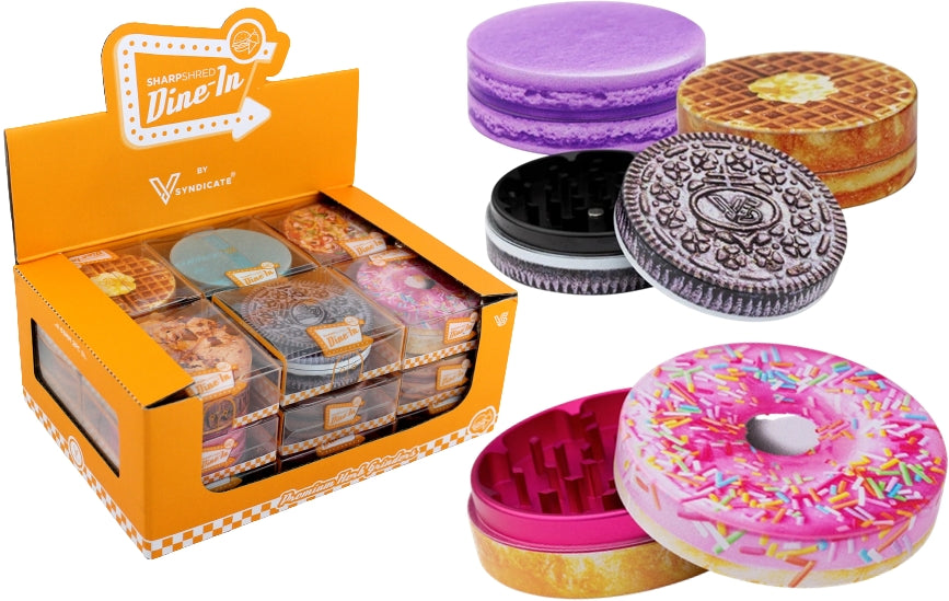 Dine-In 63mm 2pc Grinders. Styles May Vary. 18 Grinders in a Box Display.