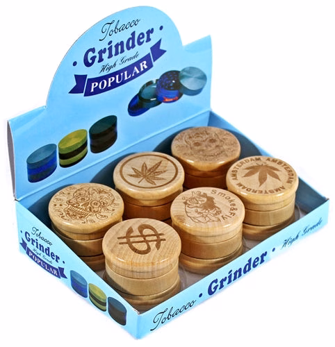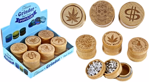 Etched Design 60mm Wood and Metal 3pc Tobacco Grinder. 6 Grinders In A Box Display.