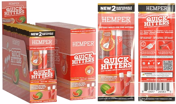 Hemper Quick Hitters – Multi-Use Disposable One Hitters. Watermelon. 20 Packs in a Box Display with 2 Hitter Per Pack.