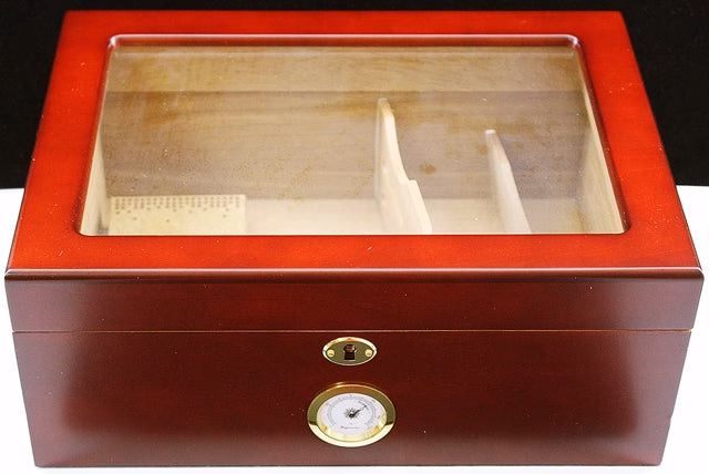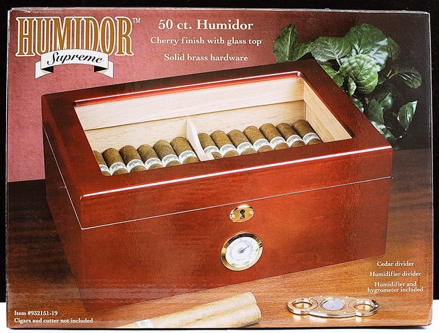 Humidor Supreme 50ct Rose Wood Finish With Glass Top Solid Brass Hardware Item no# 932151-19. 1ct.