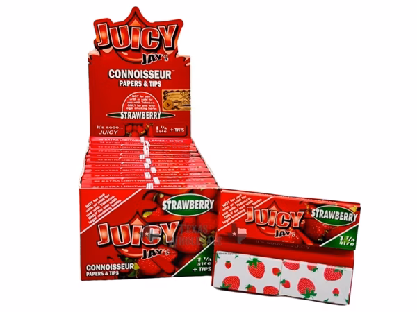 Juicy Jays Connoisseur 1 1/4 Papers & Tips – Strawberry. 24 Packs in a Box with 32 Leaves and 32 Tips in a Pack.