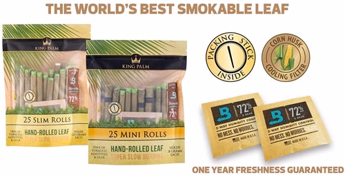 - 25 Roll Pouches come with a 72% Boveda Humidity Control Packet which keep King Palm rolls at their peak freshness for a guaranteed minimum of 1 Year.