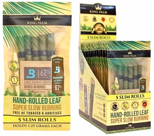 King Palm Natural Leaf Rolls – Slim Pouch. 5 Rolls Per Pack With 15 Packs In A Box Display.