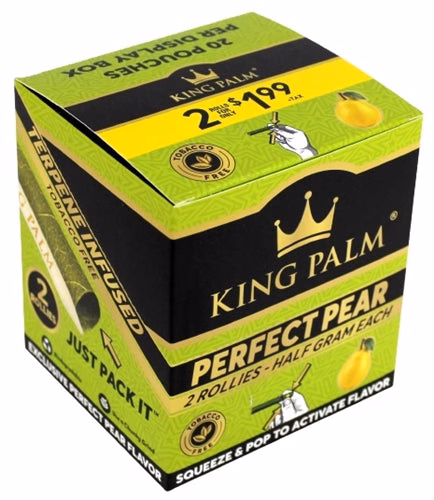 King Palm Rollies – Perfect Pear. $1.99 Pre Priced. 2 Rollies Per Pouch With 20 Pouches In A Box.