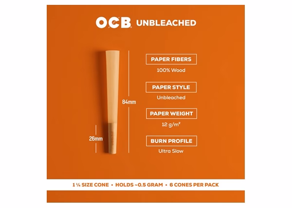 OCB Unbleached Cones – 1 1/4. 24 Packs in a Box Display with 6 Cones Per Pack.