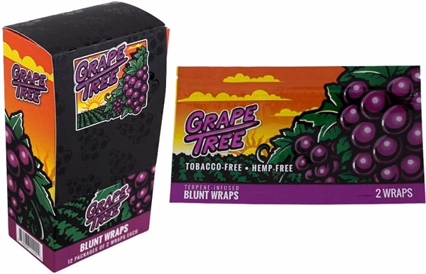 Orchard Beach Flat Blunt Wraps – Grape Tree. 12 Packs in a box display with 2 wraps per pack.