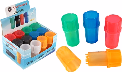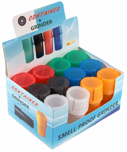 Plastic Grinder Stash Jar Container Assortment. 12 Container Grinders In A Box Display.