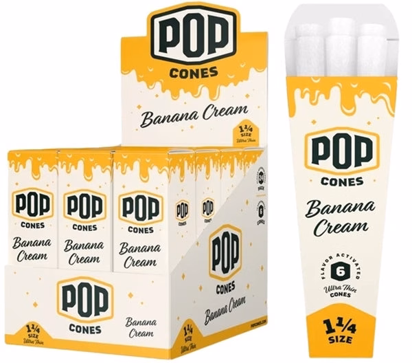 Pop Cones Flavor Activated Pre-Rolled Cones – 1 1/4 – ULTRA THIN – Banana Cream. 24 Packs in a box display with 6 cones per pack.
