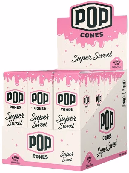Pop Cones Flavor Activated Pre-Rolled Cones – King Size – ULTRA THIN – Super Sweet. 24 Packs in a box display with 3 cones per pack.