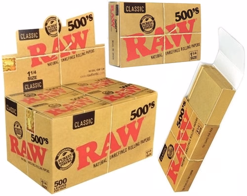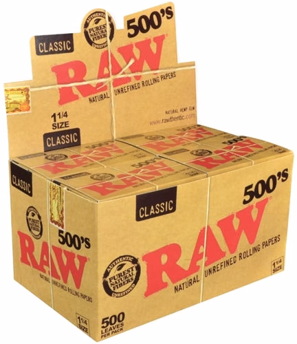 RAW Classic 500s Creaseless 1 1/4 Rolling Papers. 500 Leaves Per Pack With 20 Packs In A Box Display.