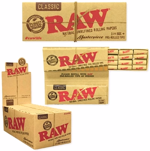 Raw Classic Papers Masterpiece 1 1/4 with Pre-rolled Tips. 24 Packs In A Box Display With 50 Leaves and 16 Tips Per Pack.