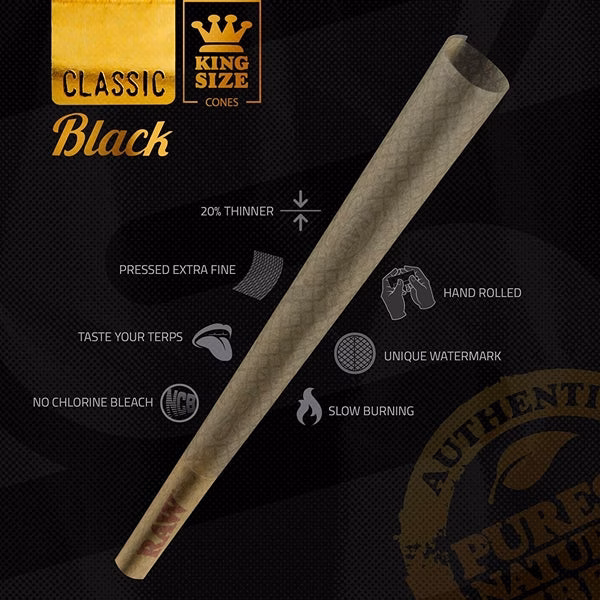 Raw Cones – Black – King Size. 32 Packs in a box display with 3 cones per pack.