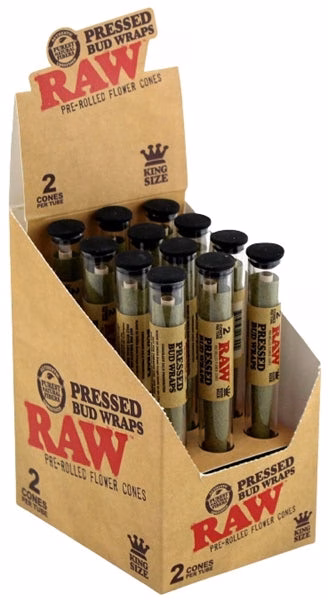 Raw Pressed Bud Wraps Pre-Rolled Flower Cones – King Size. 2 Cones Per Tube with 12 Tubes In A Box Display.