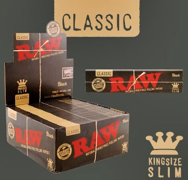 Raw Rolling Paper – Black Kingsize Slim. 50 Packs Per Box With 32 Leaves Per Pack.