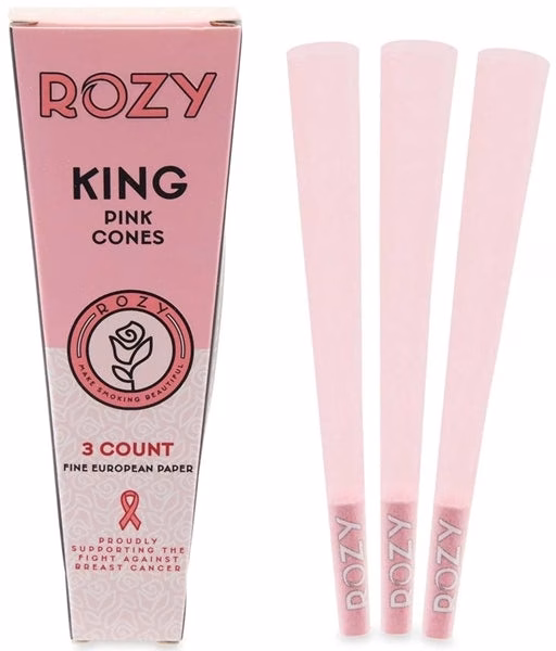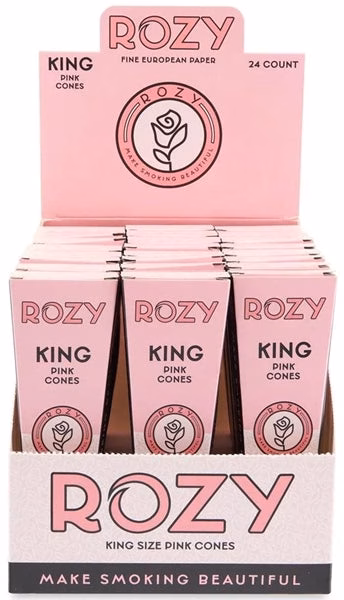 Rozy Pink Pre-Rolled Cones – King Size. 24 Packs in a box display with 3 cones per pack.