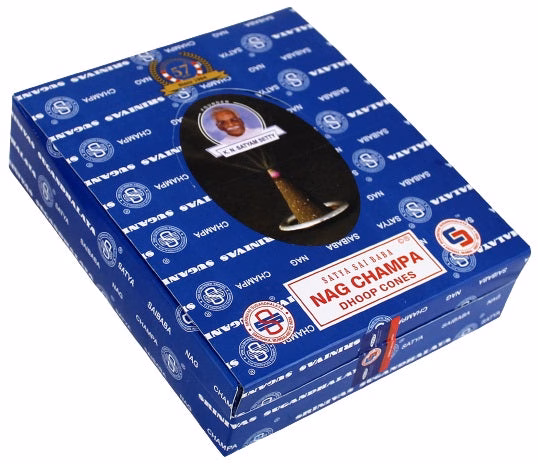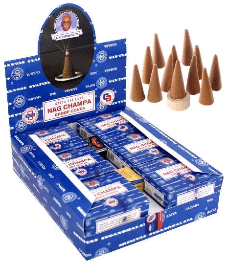 Satya Sai Baba – Nag Champa Incense Dhoop Cones. 12 Packs In A Box Display with 12 Cones and Stand Per Pack.