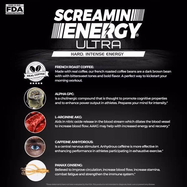 Screamin Energy Ultra, Pre-workout Energy Shot with Caffeine, L-Arginine AKG, Alpha GPC, and Ginseng, French Roast Caramel Coffee Flavor. 12 Packs in a Box Display.