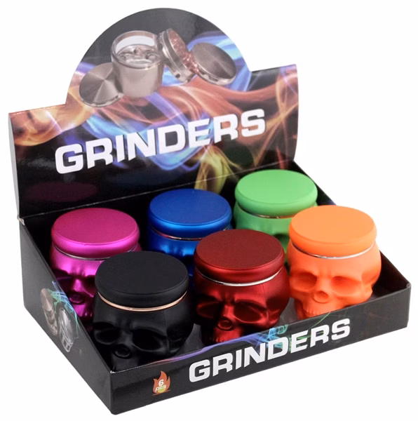 Skulls 4pc Premium Novelty Grinders. Push Open Drawer. Magnetic Base. 2.2″ x 3″. 6 Grinders in a Box Display.