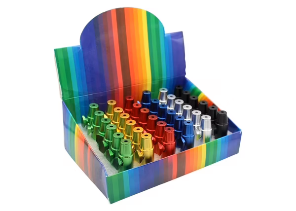 Snuff Bullet Assortment – Tapered. 2″. 36 Metal Sniffers in a Box Display.