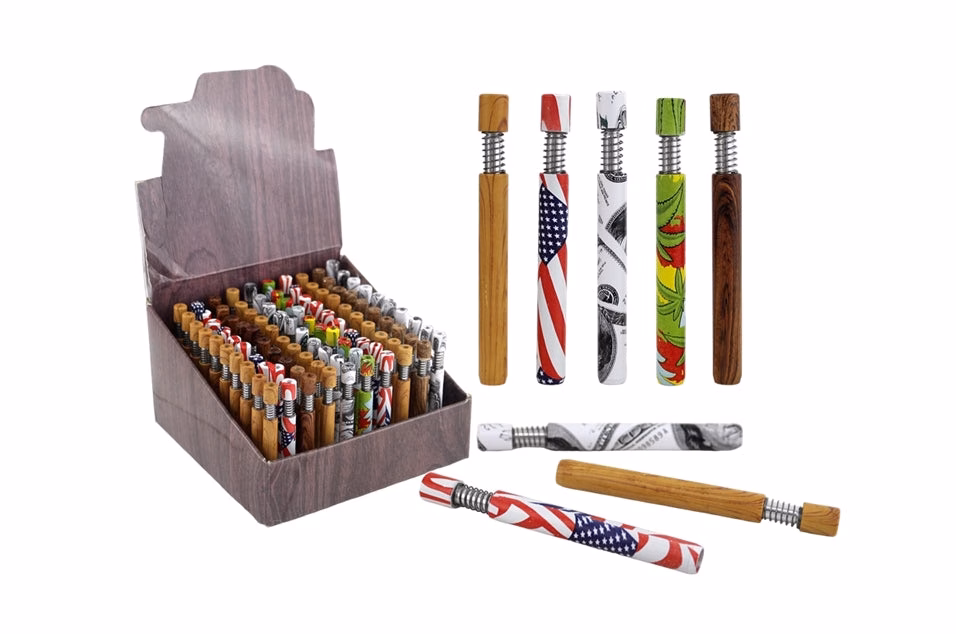 Spring Loaded Metal Pipe One HItter Chillum – Mix Design. 8x78mm. 100 Chillums in a box display.