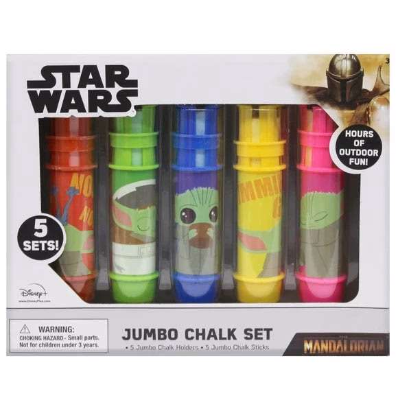 Each of the five colorful chalk sticks features a vibrant and eye-catching design inspired by Baby Yoda, capturing the essence of the iconic Star Wars universe. Not only do these jumbo chalk sticks encourage outdoor play and creativity, but they also promote physical activity and help develop fine motor skills. The set comes in a window box.