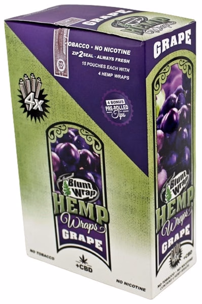 The Original Blunt Wrap – Hemp Wraps – Grape. 15 Pouches in a box display with 4 Hemp Wraps Per Pouch.