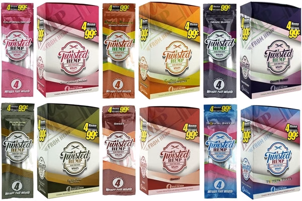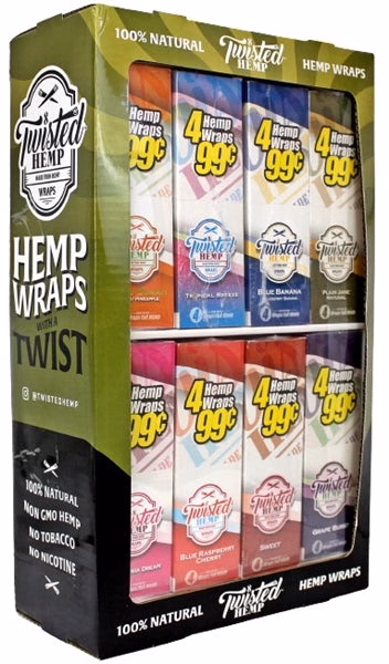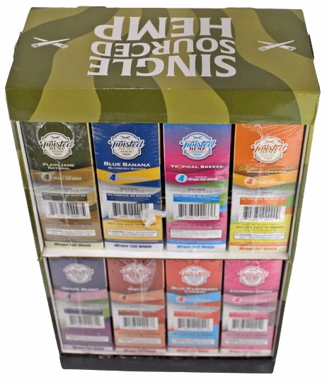 Twisted Hemp Wraps 8 Flavor Combo with Display. 8 Flavors with 15 Pouches In A Box and 4 Wraps Per Pouch.